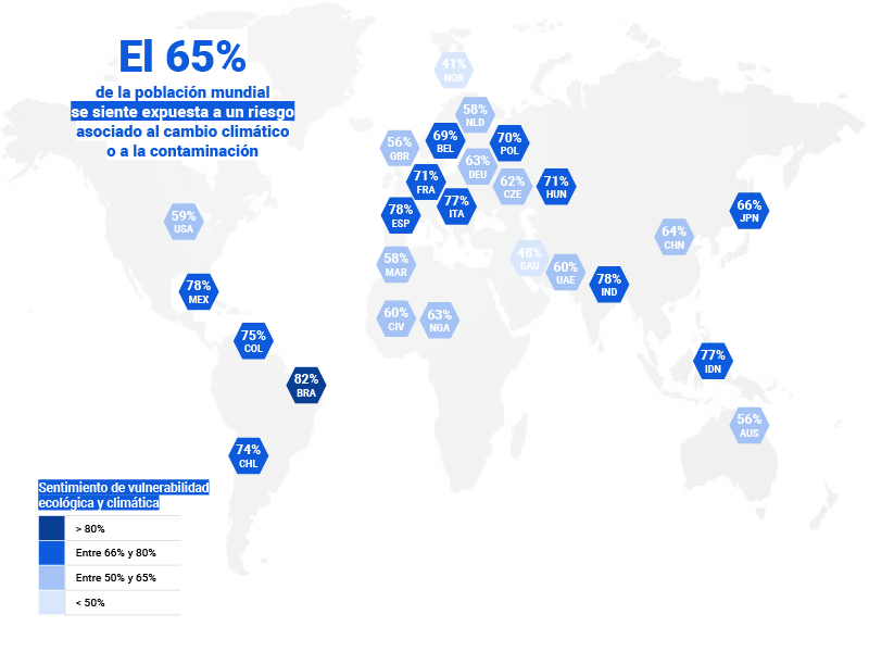 A escala mundial los rangos de percepción oscilan entre 66% y 78%. La población que se siente más vulnerada es la brasileña, seguida por la mexicana, la hindú y española. Los resultados fueron comparados por peso demográfico y volumen de emisiones de Gases de Efecto Invernadero (GEI).